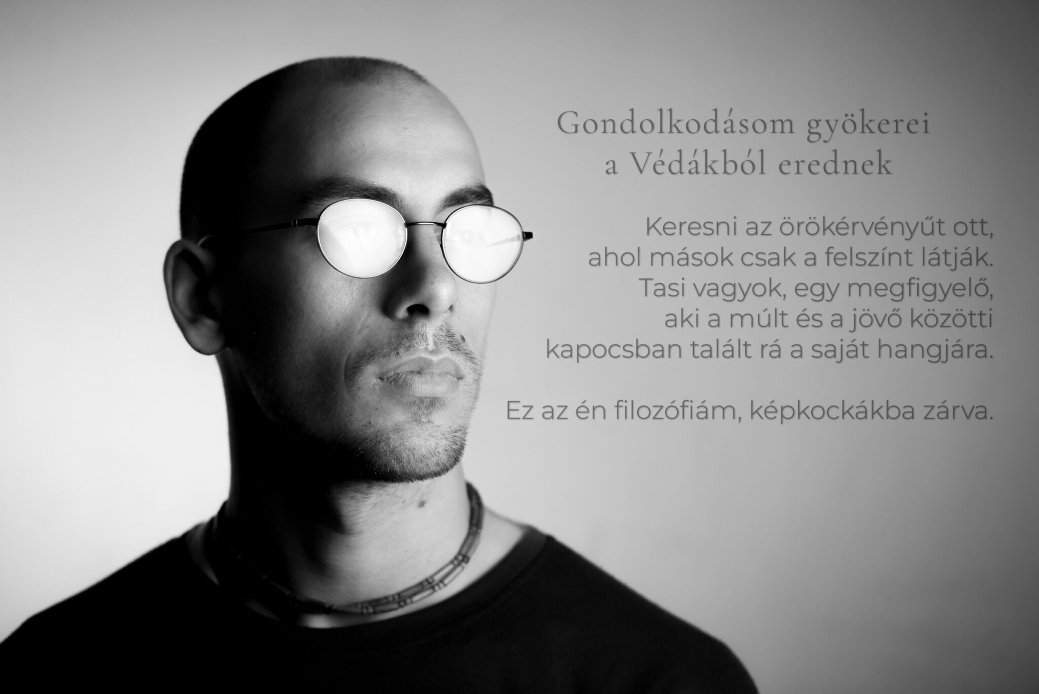 Hangulatos fotó egy erdőben álló, fényekbe néző férfiról a beszűrődő napfényben, rajta a természet és a belső béke kapcsolatáról szóló magyar nyelvű idézettel – a FotoFilo művészi hitvallása.